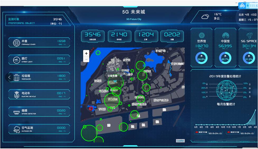 展示基于中国电信5G技术的物联网平台,可实现路灯、井盖、垃圾桶等智能化设备的互联及平台操控等功能。