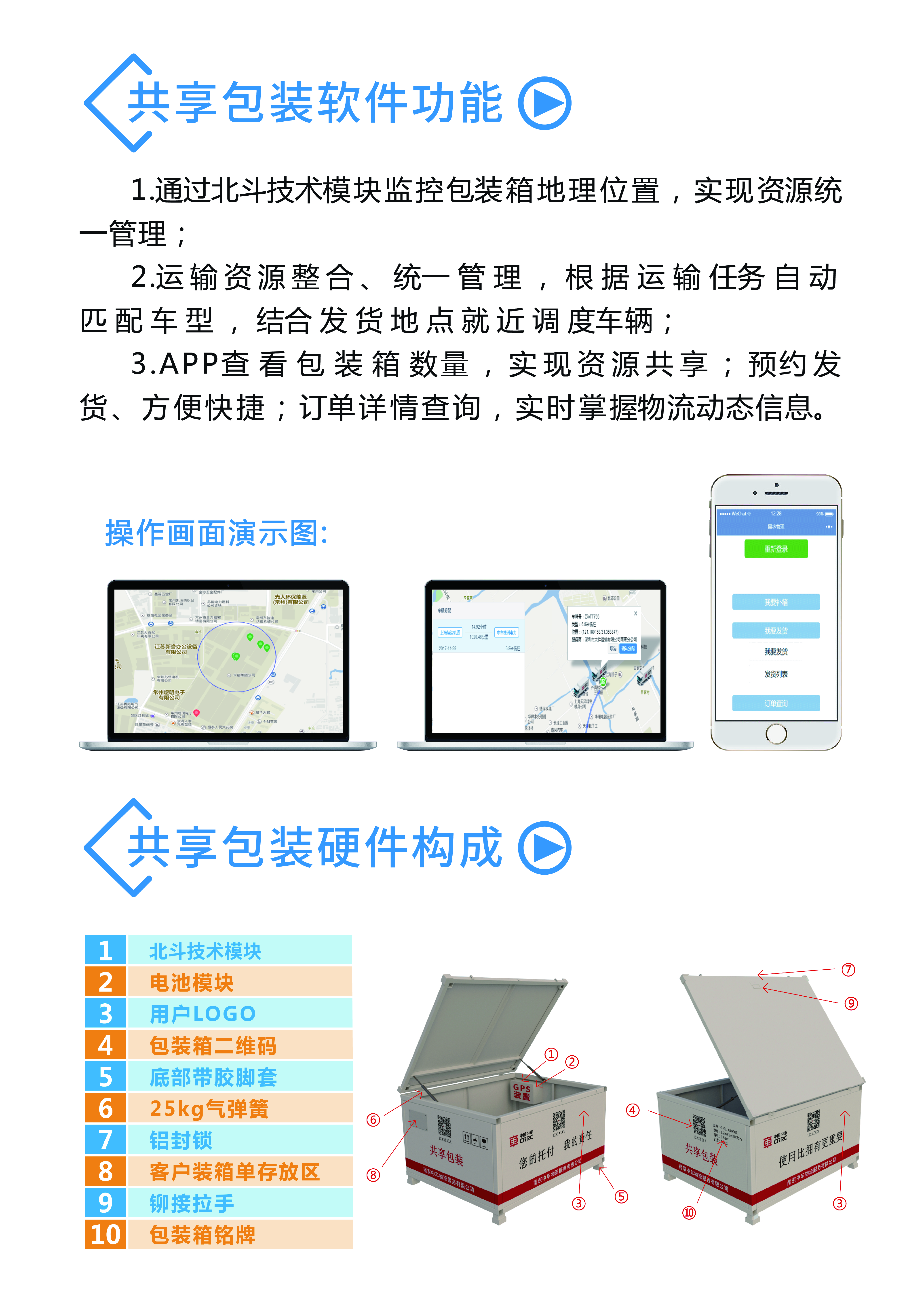 共享包装遵循标准化、通用化、轻量、人性化设计原则;在功能上实现长期循环使用、防雨防尘防磕碰、客户使用便捷性,信息系统实现全程透明,秉承“使用比拥有更重要”的经营理念,大幅降低企业直接包装成本,减少包装人工成本,以及消除包装过程中的隐形成本,同时为企业仓储管理的增值服务,从而降低企业的管理成本,为企业提供优质、高效的服务。
